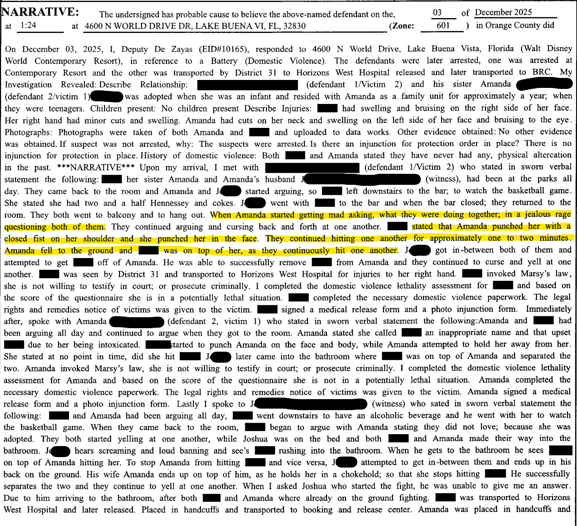 Deputies responded to Disney’s Contemporary Resort on December 3, 2025, for a domestic violence incident involving two sisters, Amanda and Katie, who were vacationing at Walt Disney World. According to the arrest report, the sisters had been arguing throughout the day. After spending time at the parks, tensions continued when they returned to their room.