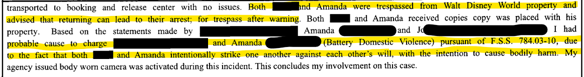 Based on statements and observed injuries, deputies determined there was probable cause to arrest both sisters for domestic battery. Amanda and Katie were transported separately to the booking and release center and trespassed from all Walt Disney World property. Deputies informed them that returning would result in arrest for trespass after warning. No children were present during the incident. Body-worn cameras recorded the entire investigation.