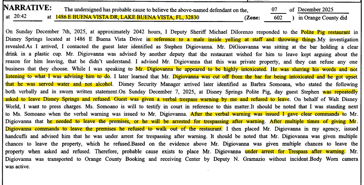On Sunday, December 7, 2025, deputies responded to The Polite Pig at Disney Springs after reports of a man yelling at staff and throwing items inside the restaurant. According to the arrest report, Deputies arrived at approximately 8:42 p.m. and located the guest, identified as Digiovanna, sitting at the bar with a clear drink in a plastic cup.