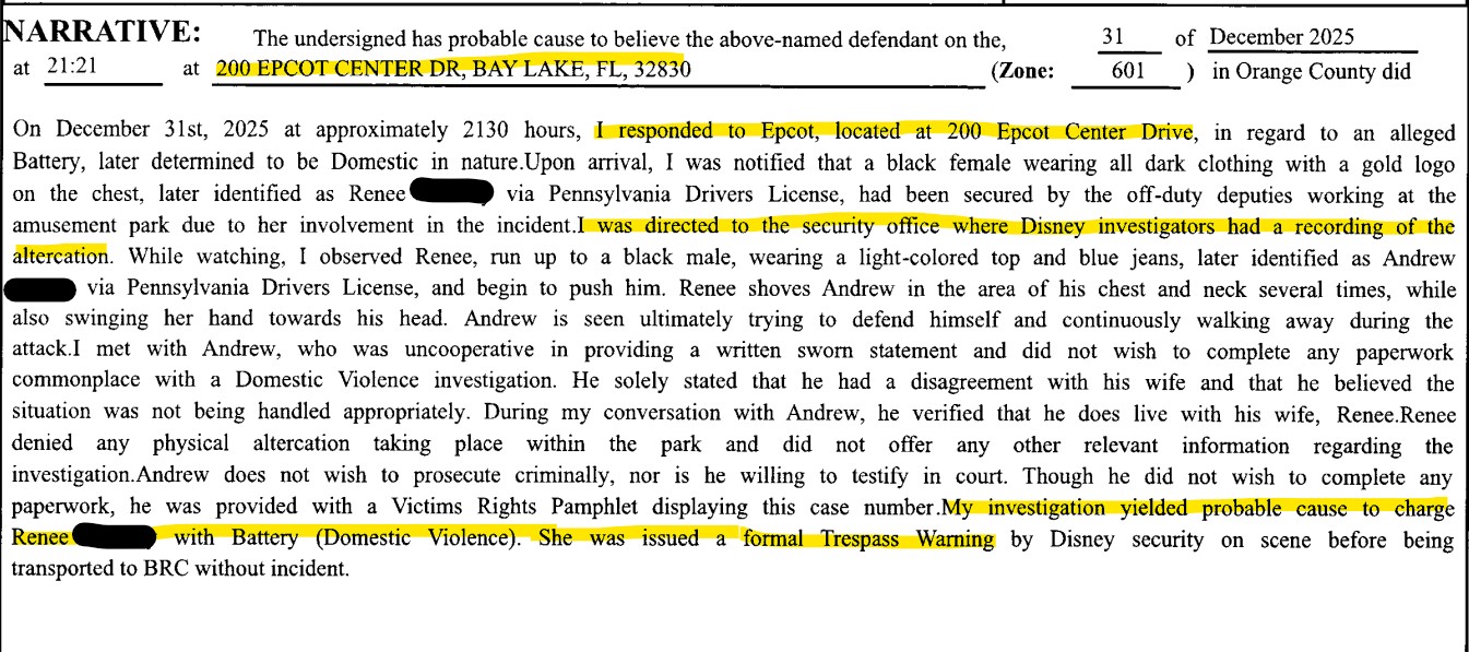 Off-duty deputies working the park had already secured Renee inside the security office prior to law enforcement’s arrival. According to the report, Disney Investigations had obtained and preserved video of the altercation, footage that became central to the case.