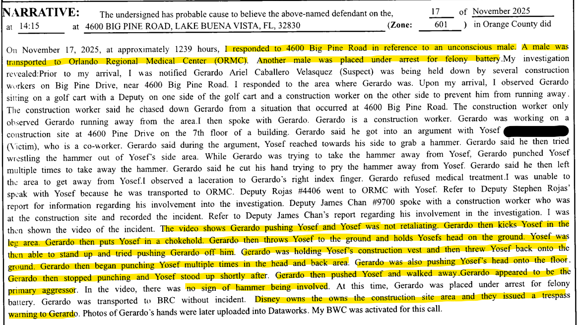 A construction site argument on Disney property escalated into a violent assault on November 17, 2025, leaving one worker hospitalized and another in handcuffs. According to the Orange County Sheriff’s Office, deputies responded around 12:39 p.m. to 4600 Big Pine Road, a Disney-owned construction area, after reports of an unconscious male.